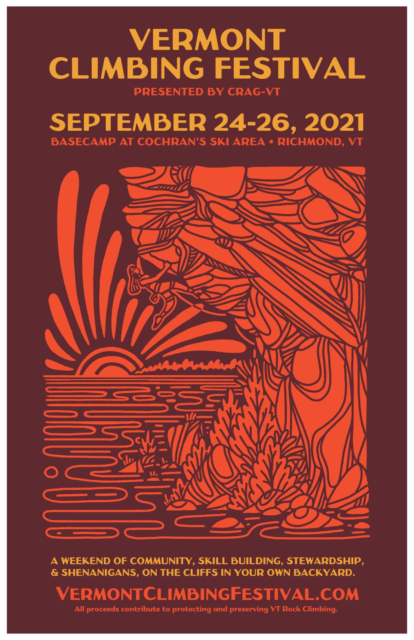 Join us this fall in Richmond, VT and on the cliffs of Bolton for the third annual Vermont Climbing Festival. Crag VT is planning a weekend of camping, climbing, workshops, clinics, competitions, speakers, music & more at Cochran’s Ski Area! Tickets go on sale August 10th and will be limited! All proceeds support the work of CRAG-VT to protect and preserve Vermont Climbing. https://cragvt.org/festival/